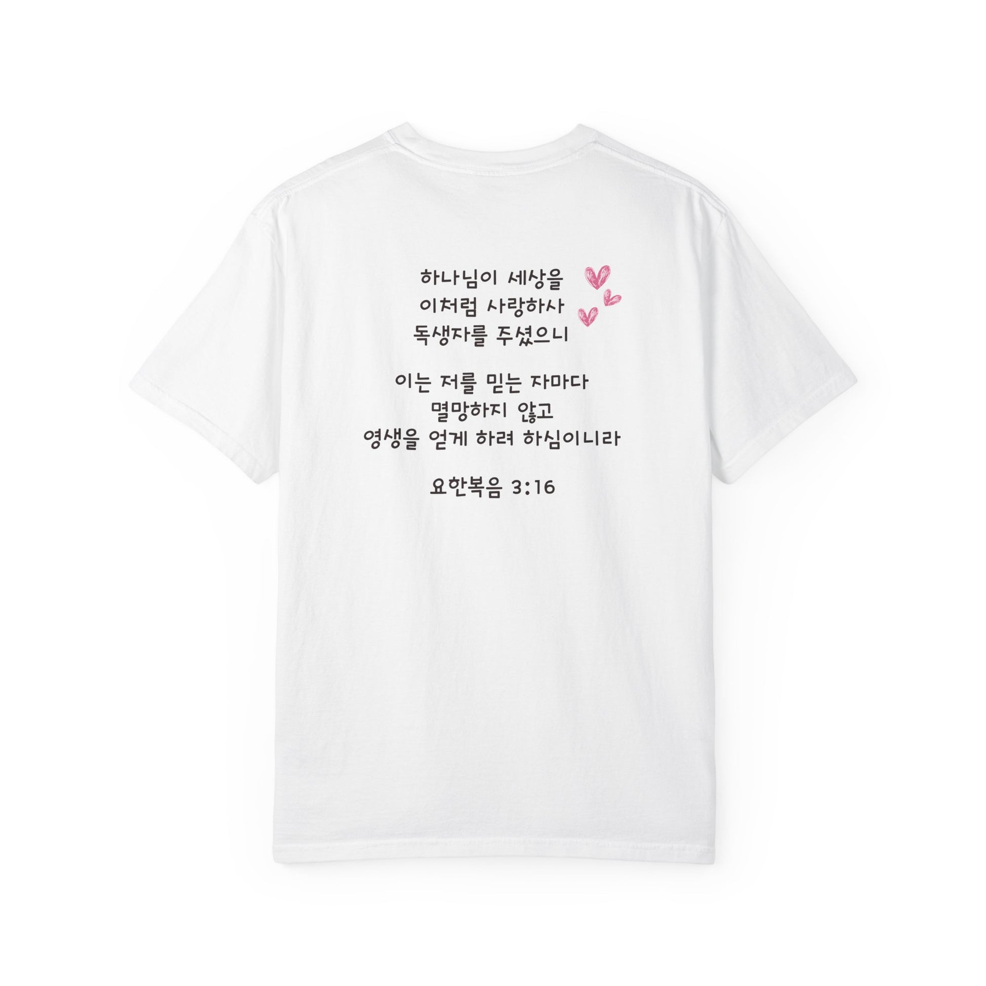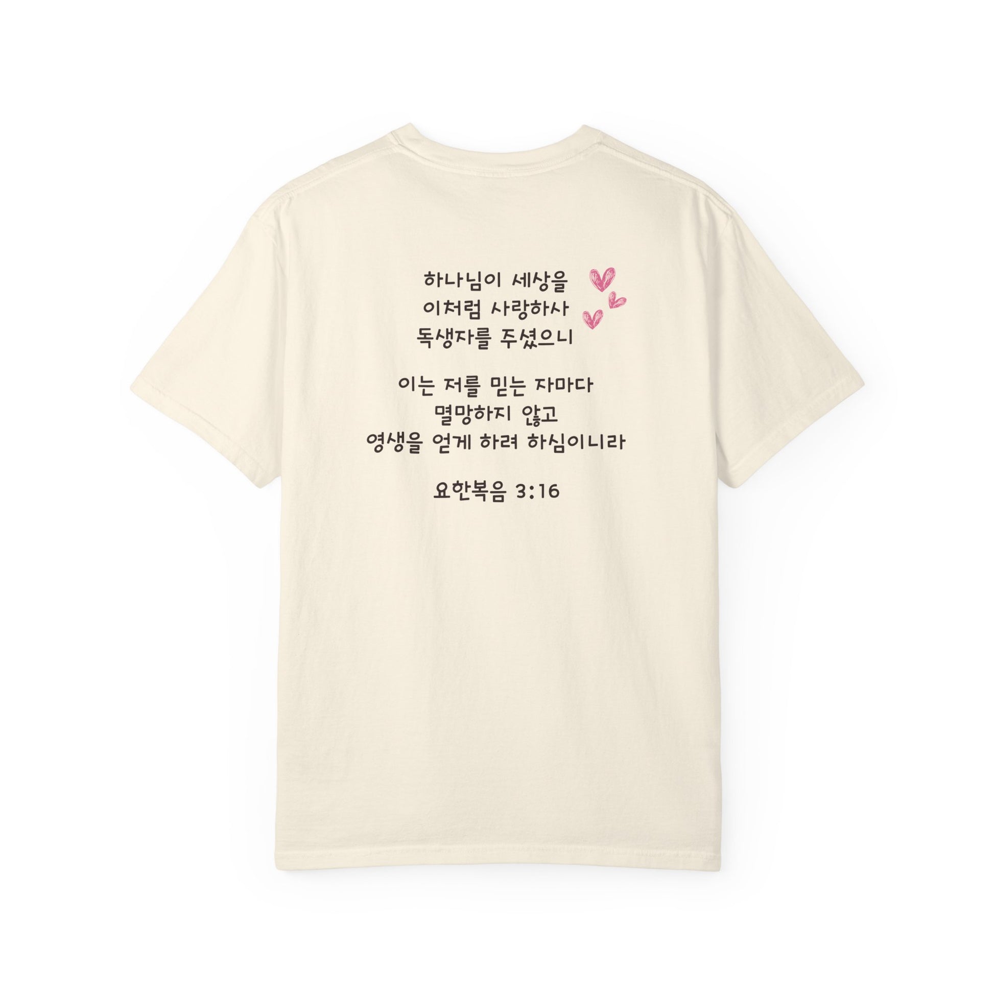 Faith meets simplicity in this soft and heartfelt design. The John 3:16 Korean Tee features the beloved verse, 요한복음 3:16, written beautifully in Hangul, a quiet reminder of love and grace that transcends language.