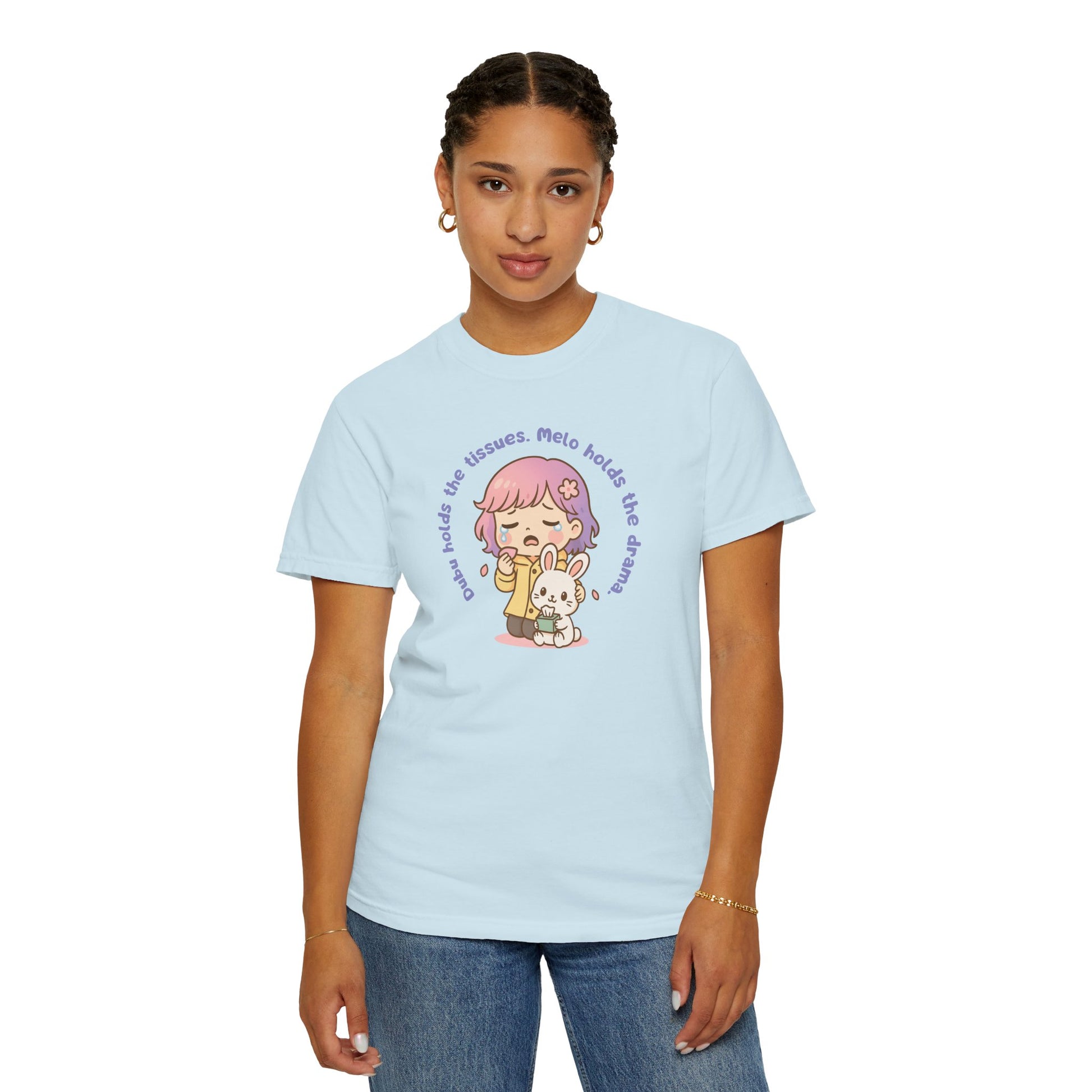 Every meltdown needs a team effort. The Dubu Holds the Tissues. Melo Holds the Drama Tee celebrates the perfect partnership: one soft bunny mascot to catch your tears, and one melodrama queen to bring them on. Equal parts cute and chaotic, this tee is your go-to uniform for crying over fictional men (again).